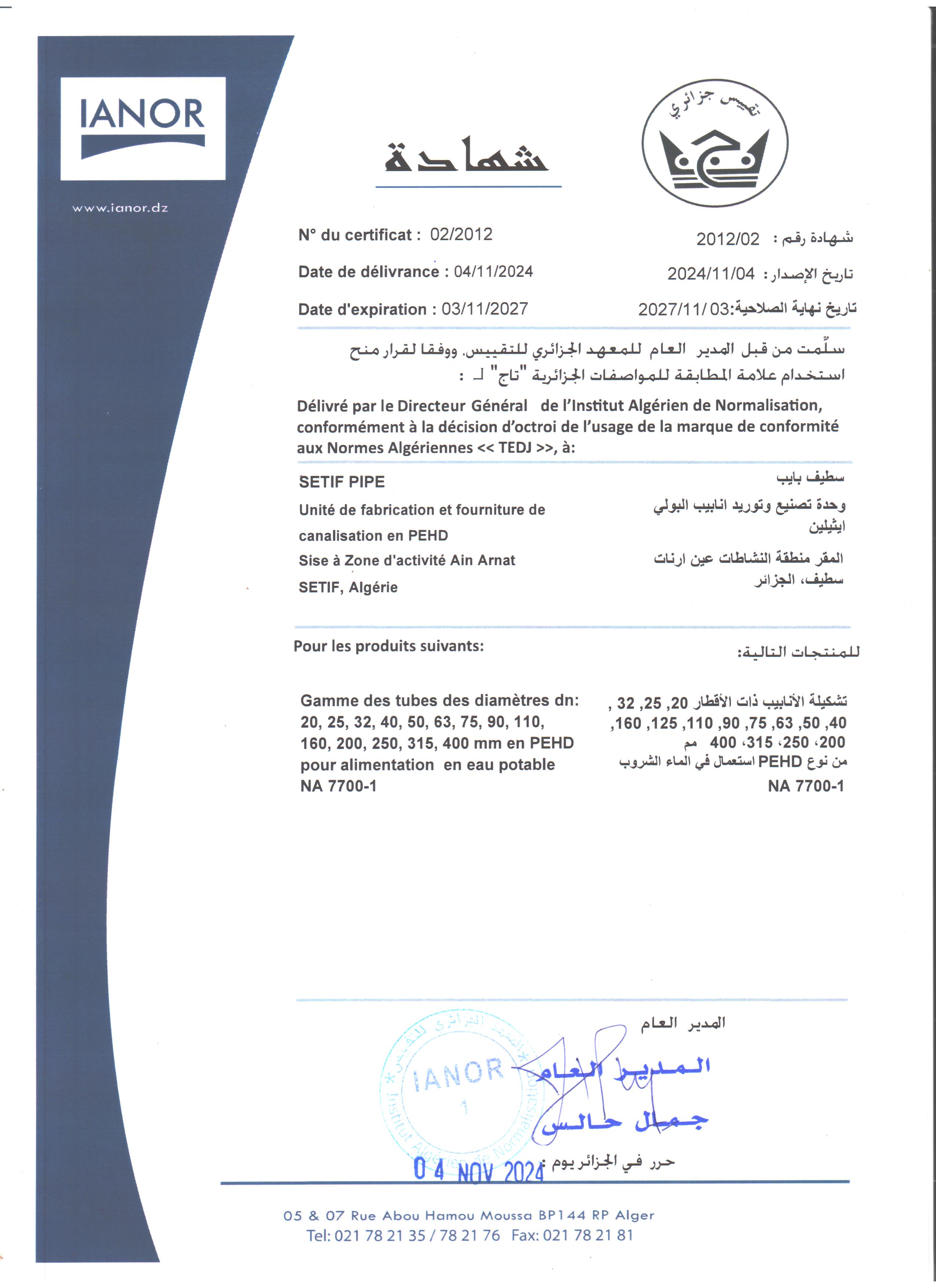Consciente que la satisfaction de ses Clients ne peut passer que par la fourniture de produits conformes aux normes et standards, SETIF PIPE s’est lancée dans une démarche de certification de produits ; couronnée d’ailleurs par l’obtention du label Tedj en 2012 pour ses produits Tubes en PEHD Eau Potable.